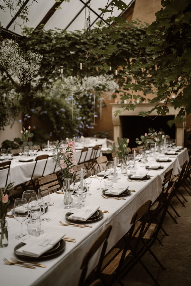 Het diner was ook in de orangerie. Het was net een sprookje: je waande je aan een grote italiaanse tafel met alleen maar familie en vrienden en niet te vergeten, goede wijn. We sloten de dag af met een buitenfeest. Het was een soort borrel setting met vuurkorven, een live jazz quartet en ‘s avonds een heerlijke pizza uit de pizzaoven! Zelfs de openhaard werd nog aangezet in de orangerie.